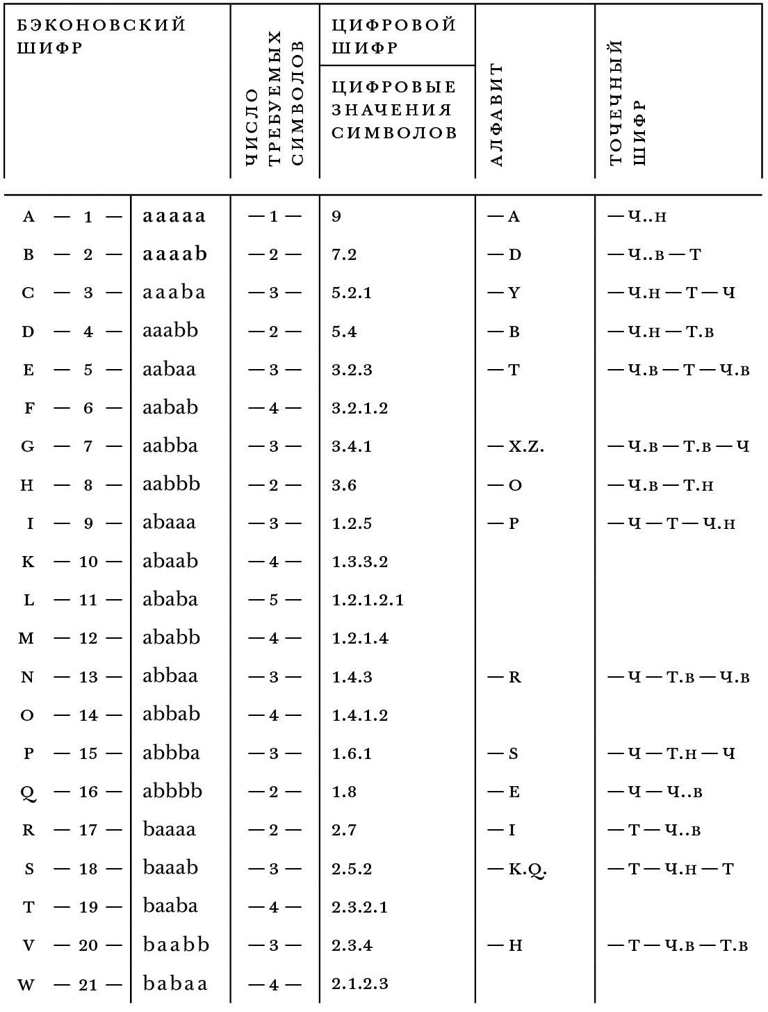 Возьмем бэконовский двухбуквенный шифр, как он сам его описывал, и устраним все повторы из четырех или пяти одинаковых знаков: aaaaa, aaaab, abbbb, baaaa, bbbba, bbbbb. Так остается полный алфавит с двумя дополнительными символами для точек, повторов, заглавных букв и так далее. Впрочем, сей метод удаления не позволяет сократить само число использованных символов – их все равно требуется по пять внешних на каждую внутреннюю букву. Следовательно, нужно попробовать другой процесс сокращения, затрагивающий разнообразие символов без связи с числом повторов каждого, вплоть до пяти.