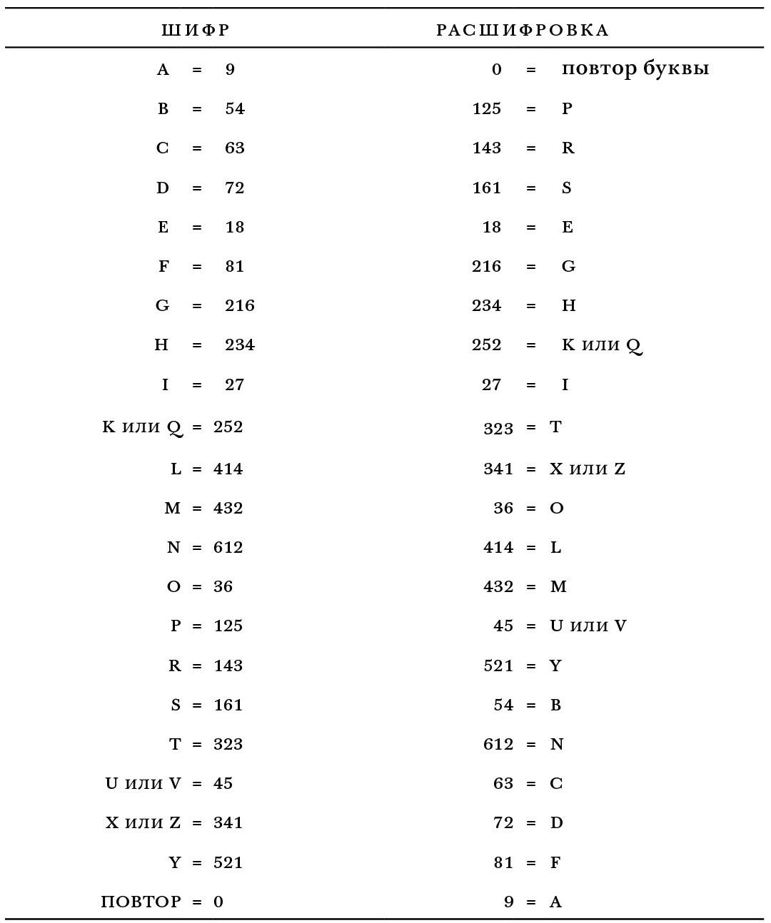 Чтобы алфавит соответствовал этому шифру, самый простой план – приберечь один символ (первый же – 0) для обозначения повтора буквы. Это не только увеличит наши возможности, но и поможет сбить со следа расшифровщиков. В выборе нуля как символа для повтора есть и особая цель: было бы странно начинать цифровой шифр с нуля, если бы он применялся в комбинациях цифр, обозначающих букву.