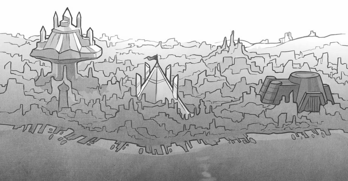 На общем фоне выделялись три строения. Одним из них был черный замок вблизи южной окраины города. С высокими, отвесными стенами, он создавал ощущение своеобразной мощи, будто горный пик. Или каменный исполин-бодибилдер. В центре города располагался странного вида белый замок, напоминавший пирамиду с башнями и парапетами. Его огромный флаг сверкал красным и был виден даже с такого расстояния.