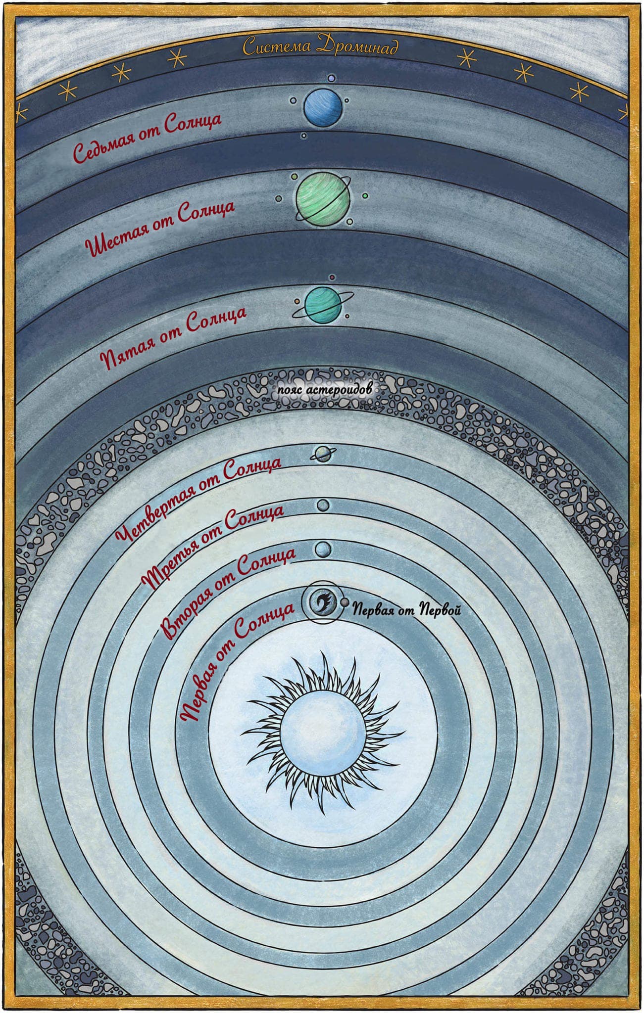 В системе под названием Дроминад три замечательные обитаемые планеты с развитыми человеческими обществами (в обитаемой зоне есть и четвертая планета). Это уникально для Космера, с Дроминадом может соперничать только Рошарская система, но там одна из планет населена исключительно щепками.