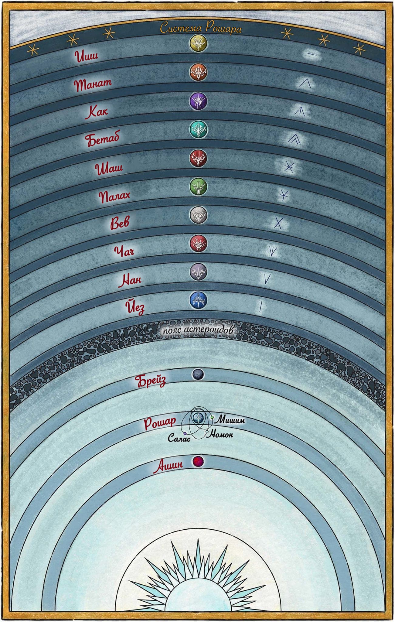 И конечно, главная планета системы – Рошар, вторая от солнца. Благодаря гравитации 0,7 и размерам 0,9 по космерскому стандарту, а также высокому содержанию кислорода в атмосфере, на Рошаре развилась разнообразная и уникальная экосистема с яркими представителями мегафауны и удивительными симбиотическими связями между существами (людьми и не только) и щепками инвеституры.