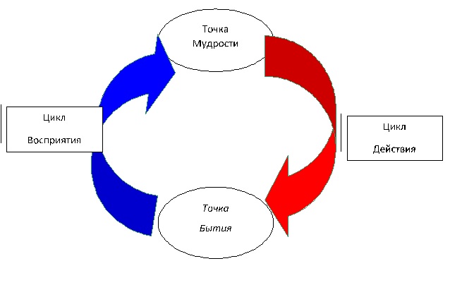 Следующая «восьмерка», которую как все остальные мы пока рассматриваем в простейшей форме – в форме КОЛЬЦА, соединяет точку БЫТИЯ с точкой ДЕЙСТВИЯ. В обычном случае наши действия почти всегда противостоят тем УЗОРАМ, которые мы сами же выписываем на правой стороне. Даже когда мы действуем по правилам, стремимся «приспособиться», а не изменить что-нибудь, чаще всего мы действуем «невпопад» – торопимся или не успеваем, и в результате почти всегда выпадаем из правильного ритма. То есть мы не ощущаем разницы между УЗОРАМИ и ОБЪЕКТАМИ; с нашей точки зрения, например, вбить гвоздь в стену, чтобы повесить картину и сделать какой-то важный деловой звонок – это действия одного порядка. Пара минут при минимальных затратах энергии.