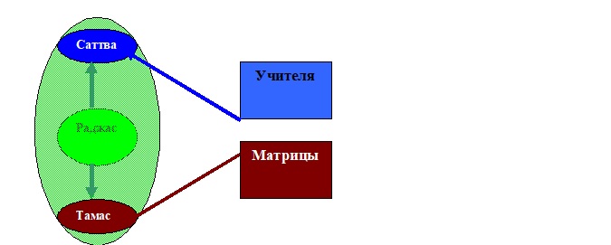 Но очень скоро равновесие нарушается – мы начинаем получать ЗНАНИЕ от других людей, расщепляя свою СИЛУ изнутри и извлекая из неё необходимые нам саттивичные элементы. В результате высвобождаются и элементы Тамаса, которые сами по себе складываются в неосознаваемые и невидимые нам «кирпичики», образующие встроенные в нас правила матриц. В результате наше «сознание» и наше «бытие» входят во все большее противоречие друг с другом, и чтобы научиться не замечать его, нам приходится принять правило устойчивости и неизменности мира, его независимости от нас.