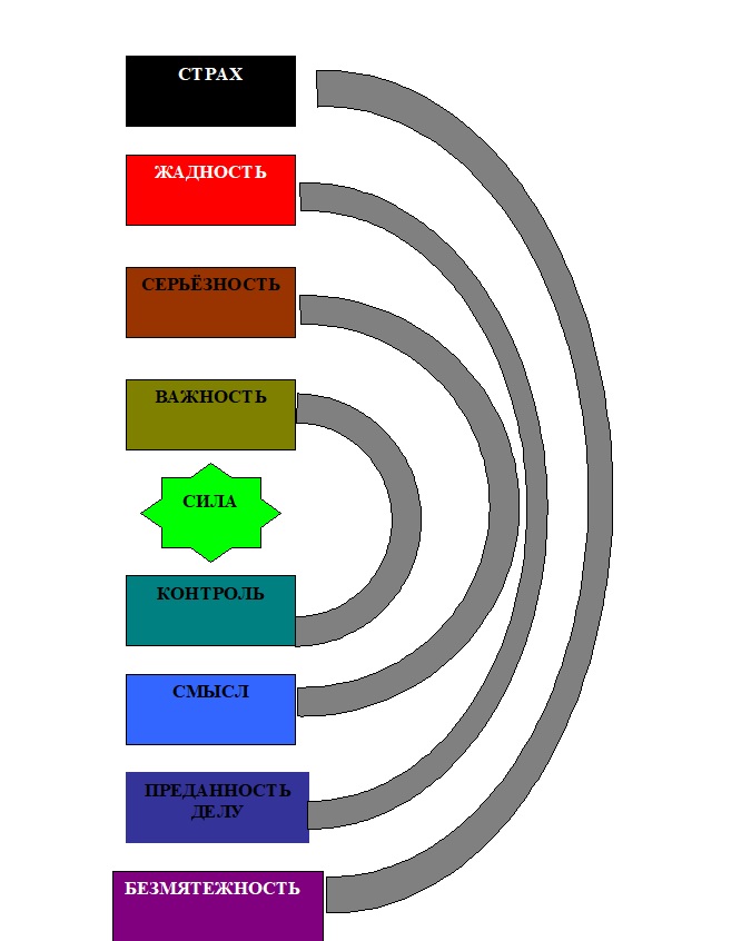 Чтобы создать собственное «Кольцо Силы», позволяющее соединить внутри нас наше «я» и нашу ИНДИВИДУАЛЬНОСТЬ, необходимо преодолеть все эти барьеры одновременно, иначе «победа» на одной стороне обернется поражением на другой стороне. Например, отказ от контроля над ситуацией делает нас «уязвимыми» (с точки зрения маленького «я»), поэтому сразу же активизируются все механизмы, связанные с ЧУВСТВОМ СОБСТВЕННОЙ ВАЖНОСТИ. И наоборот, если мы начали действовать искренне, раскрылись, то для нас оказывается жизненно необходимым сохранить контроль над ситуацией. И то же самое во всех остальных случаях.