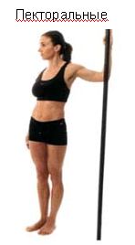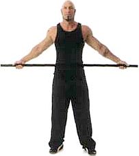 Использование трости. Другое простое техническое устройство, которую я использую в работе с клиентами – то, что я называю тростью. Орудие ничуть не более экзотическое, чем рукоятка метлы. Держите ее сзади, напротив низа спины, параллельно полу. Беритесь за нее ладонями вперед с обеих концов, вытянув руки. Проводите по крайней мере 10 минут в день в этом положении, ходя по кругу и сохраняя это положение – чем дольше, тем лучше. Трость будет оттягивать ваши плечи назад, выравнивая их надлежащим образом, и заставлять принимать ваш позвоночник более благоприятное положение. Убедитесь, что держите голову высоко и прямо: задняя часть вашего уха должна находиться непосредственно над срединной линией вашего дельтоида (неплохо было бы подыскать напарника, типа такого, как на этой картинке, чтобы ходить с вами).