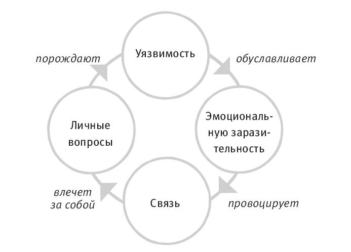 Это объясняет, почему процедура «Экспресс-дружба» настолько эффективна, и показывает, какие вопросы наверняка помогут людям установить эмоциональную связь. Существует замкнутый круг: глубокие вопросы о чувствах, жизненных приоритетах, убеждениях и опыте вызывают чувство уязвимости. Та, в свою очередь, запускает эмоциональную заразительность, и в результате мы сближаемся.