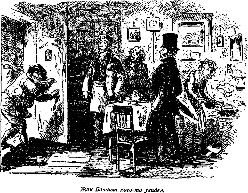 Тема была так неприятна ему и так убивала его обычную веселость, что она не настаивала, тем более, что чай давно уже был готов. Тем не менее она была очень удивлена и заинтригована, равно как и мистер Панкс, пыхтевший со времени появления итальянца, точно локомотив с тяжелым составом, взбирающийся по крутому склону. Мэгги, одетая гораздо лучше, чем в прежние времена, хотя всё еще не изменившая своим чудовищным чепцам, стояла всё время на заднем фойе сцены, разинув рот и вытаращив глаза в безмолвном удивлении, от которого не опомнилась даже теперь, когда интересный разговор внезапно оборвался. Как бы то ни было, ни слова более не было сказано на эту тему, хотя, повидимому, она занимала всех, не исключая двух юных Плорнишей, уписывавших свои порции хлеба с маслом с таким видом, точно эта операция была совершенно излишней, так как каждую минуту мог явиться самый скверный человек и съесть их. Мало-помалу, однако, мистер Батист немножко развеселился; но всё-таки он не покидал места за дверью у окна, хотя обыкновенно сидел не здесь. Как только раздавался звонок, он вздрагивал и украдкой заглядывал в лавку, придерживая в руках конец занавески, закрывавшей его лицо; очевидно, он отнюдь не был уверен, что человек, которого он боялся, не выследил его, несмотря на все обходы и повороты, с ловкостью страшной ищейки.