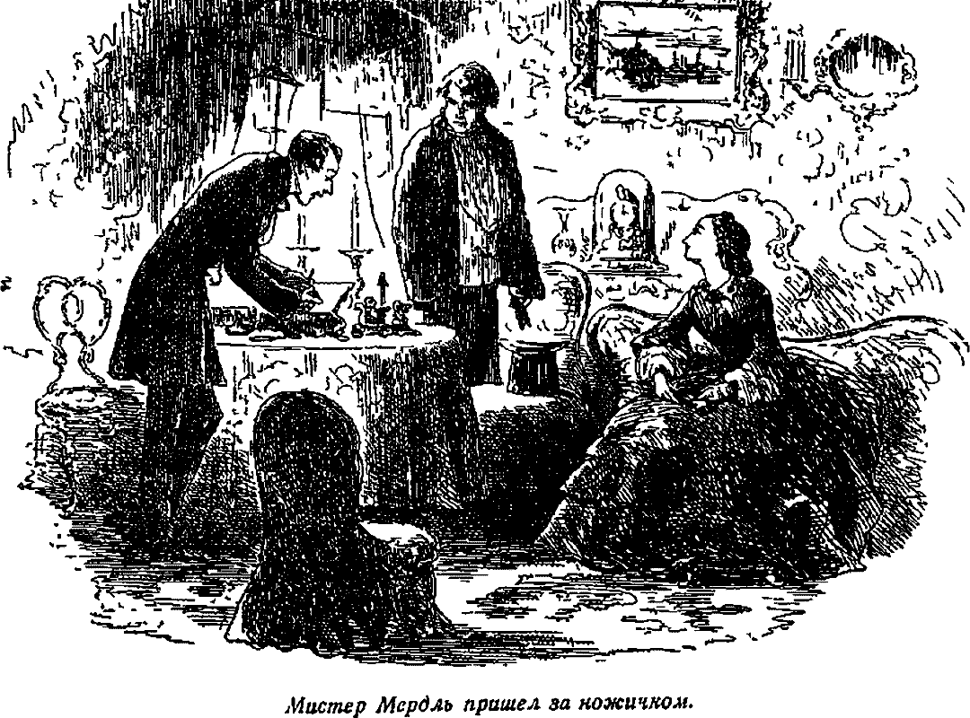 Эдмунд получил приказание открыть черепаховый ящичек и передать мистеру Мердлю черепаховый ножичек. Когда он исполнил это приказание, его супруга шутливо сказала величайшему уму нашего века: