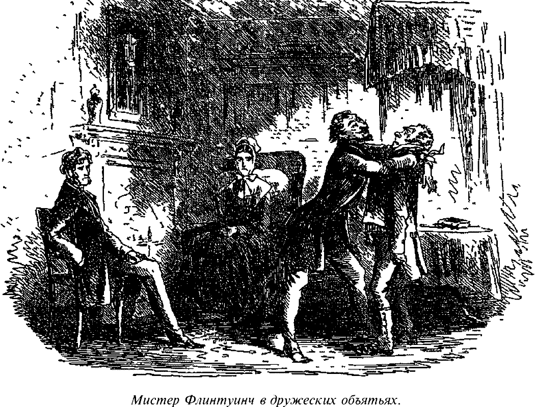 – Ах, шутник! Ах, поросеночек! – воскликнул гость. – Ха-ха-ха-ха! – И, отбросив мистера Флинтуинча в виде заключительной любезности, он уселся по-прежнему.