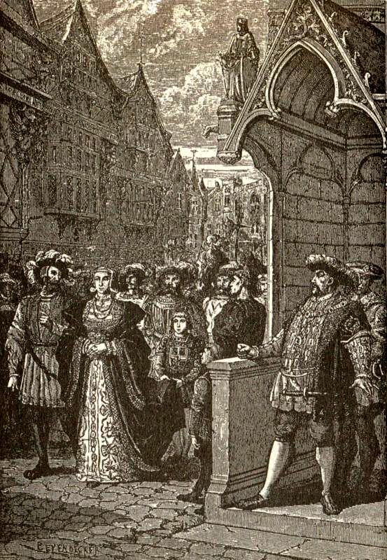 Между тем, любвеобильный монарх стал подумывать об очередной женитьбе. Он обратился к королю Франции с просьбой прислать к нему несколько придворных дам, чтоб он мог остановить на одной из них свой царственный выбор. Однако тот ответил, что не собирается выставлять своих дам напоказ, будто кобыл на ярмарке. Тогда Генрих предложил руку и сердце вдовствующей герцогине Миланской, которая ответила, что согласилась бы подумать о такой партии, будь у нее две головы, но одной рисковать боится: В конце концов Кромвель доложил королю, что в Германии есть принцесса-протестантка (приверженцев реформированной религии назвали протестантами, потому что они были против злоупотреблений и поборов не-реформированной церкви), что зовут ее Анна Клевская, что она красавица, и охотно примет его предложение. Король поинтересовался, крупная ли она женщина, – ему хотелось иметь жену по дороднее. «О да! – ответил Кромвель. – Подойдет в самый раз». Не поверив ему на слово, король отправил в Германию своего знаменитейшего живописца Ганса Гольбейна, заказав ему принцессин портрет. У Ганса Анна получилась миловидной, король остался вполне доволен, и свадьбу назначили. Мне трудно сказать, заплатил ли кто-то художнику, чтоб тот приукрасил портрет, или сам он польстил принцессе из сугубо деловых соображений, как случалось не с одним мастером и до него, но только я знаю, что когда Анна пожаловала в Англию, король, встречавший ее в Рочестере, увидел ее первым, обозвал «здоровенной фландрской кобылой» и наотрез отказался на ней жениться. Жениться ему однако пришлось, – дело слишком далеко зашло, но приготовленные для принцессы подарки он зажал и даже не глядел в ее сторону. Сватовства этого Кромвелю он так и не простил. Именно с него и началось падение этого человека.
