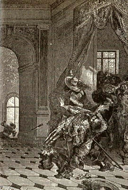 Несносный Бекингем, дабы потешить свое уязвленное самолюбие, к этому времени втянул страну, воевавшую с Испанией, в войну с Францией. До чего же ничтожными порой бывают причины войн и люди, их затевающие! Но Бекингему оставалось недолго бесчинствовать на этой земле. Однажды утром, направлюсь к стоявшему на готове у входа экипажу, он обратился к сопровождавшему его полковнику Фрайеру и в этот миг был зверски заколот ножом, который убийца оставил в его сердце. Случилось это у него дома в зале. Как раз перед тем Бекингем повздорил наверху с каким-то французом, которого слуги немедленно заподозрили, и тот едва унес ноги. Среди неразберихи настоящий убийца укрылся в кухне и мог бы запросто удрать, но, выхватив шпагу, он крикнул: «Я тот, кого вы ищете!» Звали его Джон Фелтон, был он протестант и отставной офицер. Фелтон объяснил, что лично он не держал зла на герцога, но прикончил потому, что считал проклятием страны. Фелтон хорошо рассчитал удар, Бекингем успел воскликнуть: «Разбойник!», выдернул нож, рухнул на стол и умер.