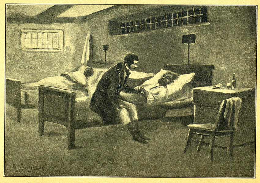 Несчастный Магвичъ лежалъ въ тюрьмѣ, сильно больной: онъ сломалъ себѣ два ребра, и они поранили одно изъ легкихъ, такъ что онъ еле дышалъ и почти не могъ говорить. Онъ былъ слишкомъ боленъ, чтобы оставаться въ обыкновенной тюрьмѣ, поэтому его перевели на другой день въ лазаретъ. Благодаря этому, я могъ проводить около него больше времени, чѣмъ это было бы возможно при другихъ обстоятельствахъ. И, если бы не его болѣзнь, его держали бы въ кандалахъ, такъ какъ онъ считался закоренѣлымъ бѣглецомъ и, не знаю, какимъ еще злодѣемъ.