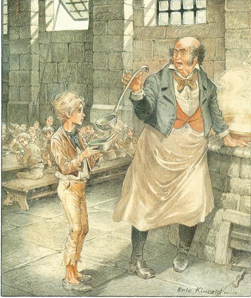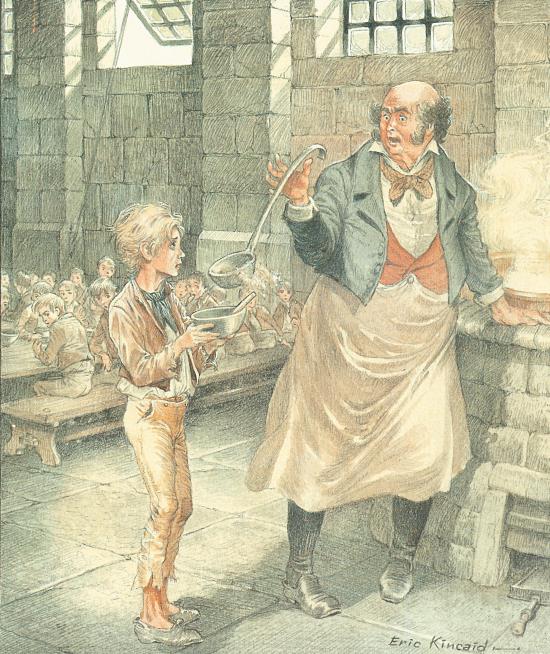 Подошло время обеда, и надзиратель, как обычно, занял место у котла, откуда черпал похлёбку. Голодные дети перешёптывались и подавали знаки Оливеру.