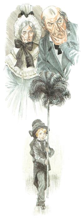 Молча выслушав эту новость, мальчик отправился собирать свои скудные пожитки. Все они уместились в пакет из обёрточной бумаги. Затем Оливер надвинул шапку на глаза, вновь уцепился за обшлаг мистера Бамбла и отправился с ним к месту новых терзаний.