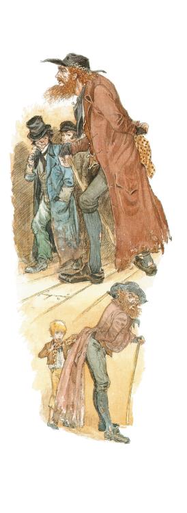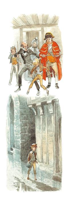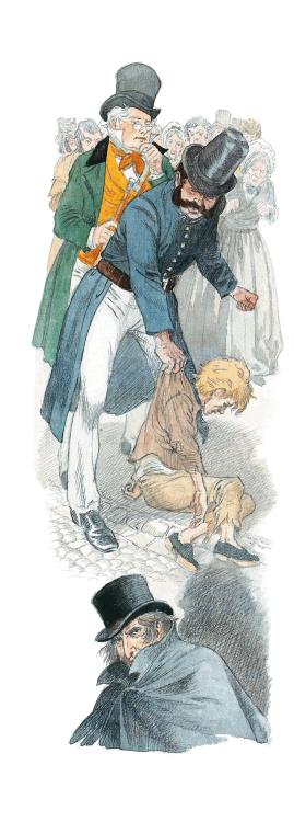 Оливера догнали, схватили и бросили на мостовую. Он лежал, покрытый грязью и пылью, с разбитыми до крови губами. Почтенный джентльмен вышел вперёд.