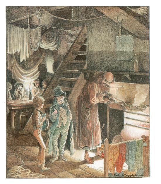 У потрескивающего очага сморщенный старик жарил на сковороде сосиски. Его уродливое лицо наполовину скрывала клочковатая рыжая борода. Старик, одетый в засаленный фланелевый халат, делил своё внимание между сосисками и многочисленными шёлковыми платками, сохнувшими на вешалке.