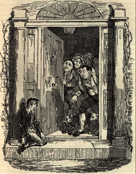 Ускорив шаги, они свернули влево, на дорогу. Пройдя примерно четверть мили, они подошли к одиноко стоявшему дому, обнесенному стеной, на которую Тоби Крекит, даже не успев отдышаться, вскарабкался в одно мгновение.