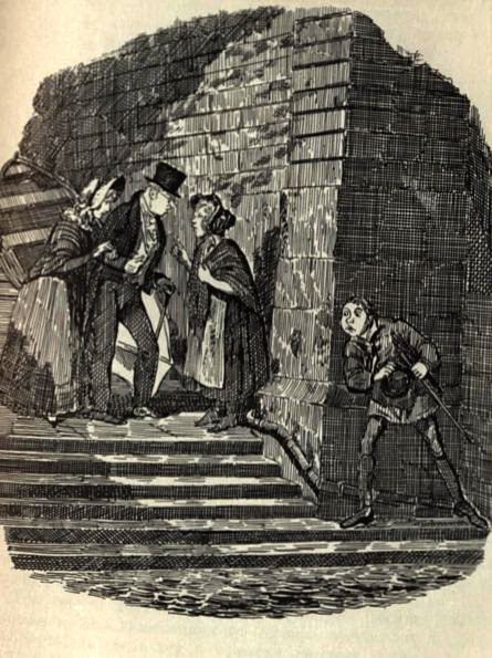 Ночь была очень темная, погода стояла плохая, и в этот час и в таком месте людей было мало. Немногие прохожие быстро шли мимо, по всей вероятности, не замечая ни женщины, ни мужчины, который не терял ее из виду, и, уж конечно, не обращая на них внимания. Не такой был у них вид, чтобы привлекать докучливые взоры тех лондонских нищих, которые случайно проходили в тот вечер по мосту в поисках какой-нибудь холодной ниши или лачуги без дверей, где можно приклонить голову. Оба стояли молча – ни с кем не заговаривали, и никто из прохожих не заговаривал с ними.