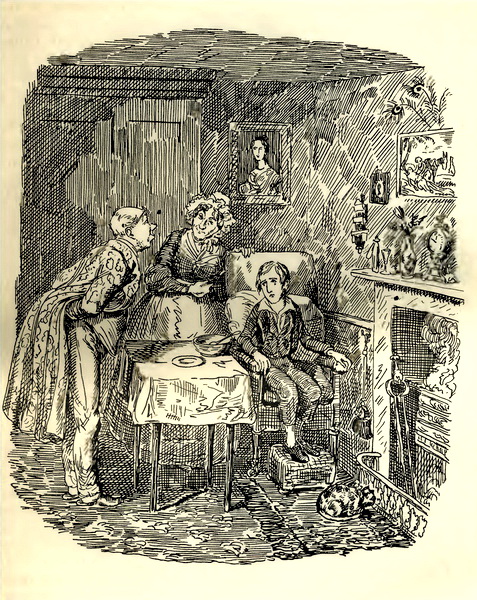 Прошло три дня – и он уже мог сидеть в кресле, со всех сторон обложенный подушками; а так как он все еще был очень слаб и не мог ходить, миссис Бэдуин – экономка – на руках перенесла его вниз, в маленькую комнатку, которую она занимала. Усадив его здесь у камина, добрая старая леди тоже села и, в восторге от того, что он чувствует себя гораздо лучше, расплакалась не на шутку.