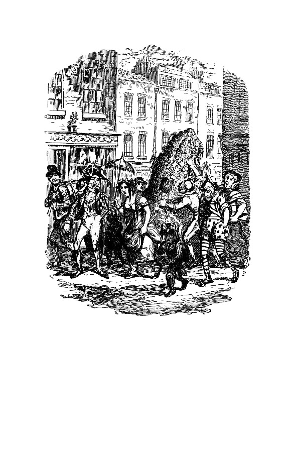 Голову ее украшал целый ворох искусственных цветов; в руке она держала большой медный половник, куда должно было сыпаться то, что она образно называла «оловяшками». Далее взорам нашим представился юнец в женском платье и вдовьем чепце; два клоуна, шедшие на руках по грязи к неизмеримому удовольствию всех зрителей; человек с барабаном и еще один, с флажолетом; неопрятного вида женщина в огромной шали, с ящиком для денег под мышкой, и – последний по очереди, но не по значению – «Джек-в-Зелени», представляемый не кем иным, как нашим другом в брезентовом костюме.