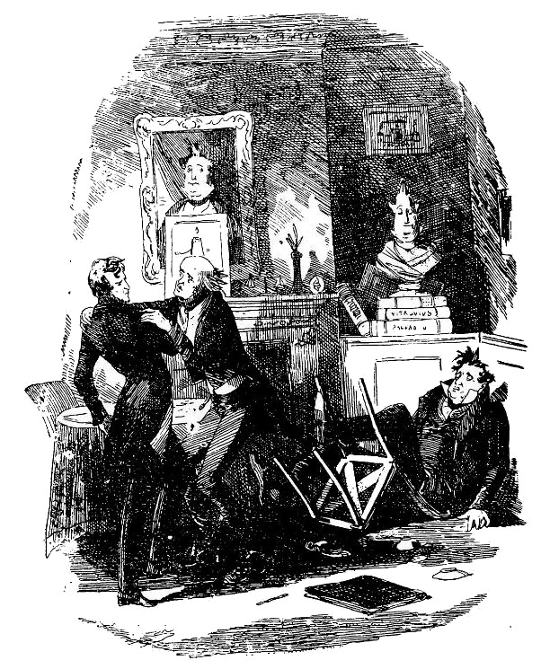 Трудно сказать, для чего Мартин при этих словах сделал шаг вперед. Довольно нам знать, что Том Пинч удержал его в своих объятиях и что мистер Пексниф так поспешно попятился, что оступился, споткнулся о стул и с размаху сел на пол, где и остался недвижим, не делая попытки подняться и уткнувшись головой в угол, – быть может потому, что считал это место самым безопасным.