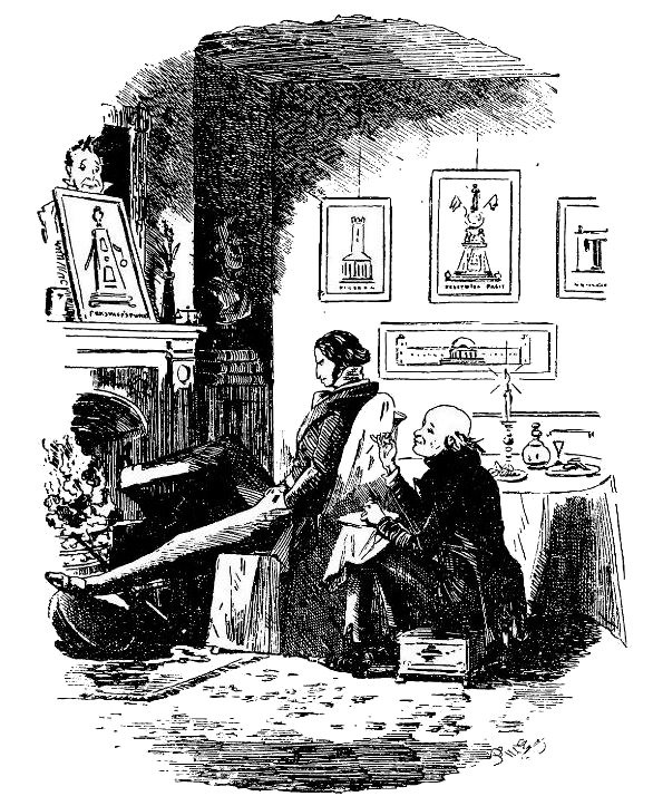 Мистер Пинч как раз в это время задумчиво смотрел на решетку в камине. Но как только его собеседник умолк, он вздрогнул и сказал: