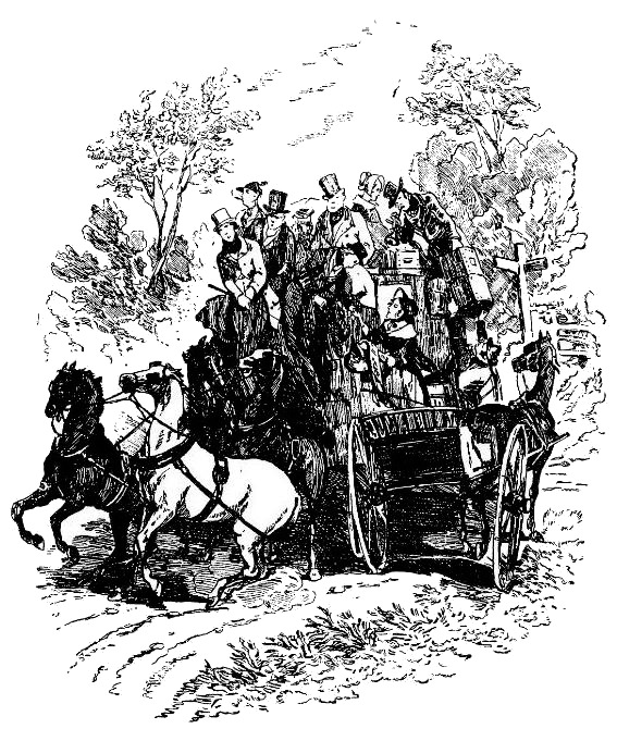 С такими мыслями и чувствами Том еще раз улегся на низкую кровать с четырьмя колонками, к великому изумлению портретов прежнего хозяина и жирного быка, и в том же расположении духа провел весь следующий день. Когда, наконец, подошел дилижанс с золотыми буквами "Лондон" на багажном ящике, это так потрясло Тома, что ему чуть ли не захотелось убежать. Однако он не убежал; он занял свое место на козлах, и здесь, глядя вниз, на четверку серых коней, чувствовал себя так, как будто он был пятым конем или по меньшей мере какой-то частью упряжки, причем сильно смущался новизной и великолепием своего положения.