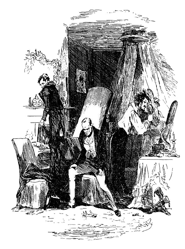 С этими словами он поспешно схватил головные щетки и начал приглаживать себе волосы, как будто его туалет и не прерывался. Мистер Неджет удалился к камину, где разведен был небольшой огонь для нагревания щипцов, и, воспользовавшись удобным случаем просушить носовой платок, не теряя времени, вытащил его из кармана. Так он и стоял в течение всего разговора, держа платок перед огнем и только изредка оглядываясь через плечо.