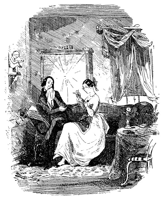 – Зато теперь, – продолжала миссис Тоджерс, – теперь он совсем присмирел. Чуть поглядишь на него, он уже готов удариться в слезы. По воскресеньям сидит со мной целый день и так жалостно разговаривает, что у меня потом едва хватает сил что-нибудь делать для жильцов. Для него единственное утешение – в женском обществе. Он водит меня в театр на дешевые места, и до того часто, что я боюсь, как бы он не разорился; и во все время спектакля я вижу слезы у него на глазах, особенно если играют что-нибудь смешное. Что со мной только делалось, – продолжала миссис Тоджерс, приложив руку к сердцу, – когда служанка уронила коврик из окна его комнаты, вы не можете себе представить. Я так и думала, что это он – взял да и выбросился наконец!
