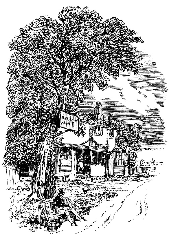 В этот час маленькая придорожная гостиница, уютно притулившаяся под огромным вязом, чей мощный ствол был окружен удобной скамьей для отдыхающих, особенно приветливо – как и подобает общественному зданию, – обращала свой фасад к путешественнику, соблазняя его многими немыми, но выразительными обещаниями радушного приема. Высоко на дереве ярко-красная вывеска с золотыми буквами, сиявшими на солнце, игриво поглядывала на прохожего из-за зеленых веток, словно жизнерадостное личико, и сулила ему хорошее угощение. Колода, полная чистой, свежей воды, и земля под нею, усеянная клочками душистого сена, манили каждую проходившую здесь лошадь, и та настораживала уши. Малиновые шторы на окнах нижних комнат и чистые белые занавески на окнах маленьких спален во втором этаже с каждым дуновением ветерка, казалось, призывно кивали: «Войдите!» На ярко-зеленых ставнях надписи, начертанные золотом, повествовали о пиве и эле, о добрых винах и мягких постелях, и там же красовалось выразительное изображение коричневого кувшина с пеной, бьющей через край. На подоконниках стояли цветущие растения в ярко-красных горшках, красиво подчеркивавших белизну стен, а сумрак за входной дверью пестрили блики света, отраженного блестящей поверхностью бутылок и оловянных пивных кружек.
