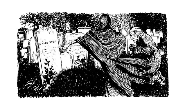 Призрак остановился среди могил и указал на одну из них. Скрудж, трепеща, шагнул к ней. Ничто не изменилось в обличье Призрака, но Скрудж с ужасом почувствовал, что какой-то новый смысл открывается ему в этой величавой фигуре.