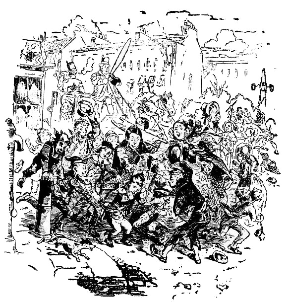 В это самое время Полли, безнадежно посматривая вдоль улицы, после доброго часа ходьбы заявила, что нет смысла идти дальше, как вдруг увидела это зрелище. Едва завидев его, она вскрикнула и, передав юного Домби черноглазой, бросилась на выручку своего злополучного сынка.