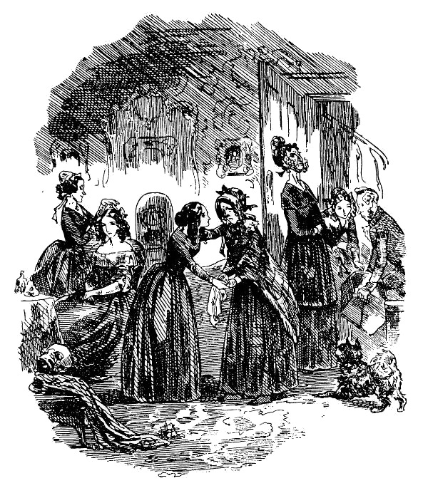 У Сьюзен не хватило духу хотя бы бросить взгляд на миссис Пипчин. Она сделала реверанс миссис Домби (та не сказала ни слова и наклонила голову, избегая смотреть на кого бы то ни было, кроме Флоренс) и в последний раз обняла на прощанье свою хозяйку, которая в свою очередь обняла ее. В этот критический момент лицо бедной Сьюзен, обуреваемой волнением и мужественно подавляющей рыдания из страха, что они прорвутся и позволят миссис Пипчин восторжествовать, претерпевало изумительные и доселе невиданные изменения.