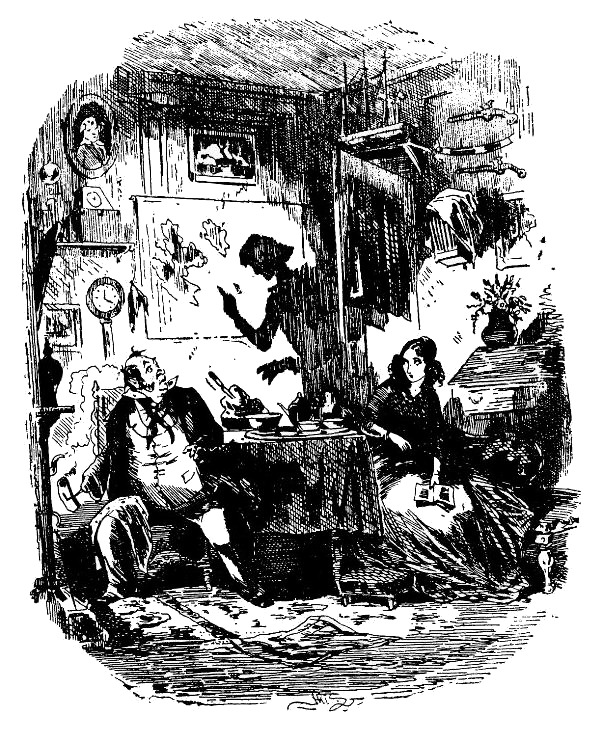 В мансарде в доме Деревянного Мичмана пустовала комната, которая в былые времена служила Уолтеру спальней. Разбудив капитана рано утром, Уолтер предложил перенести туда из маленькой гостиной наилучшую мебель для украшения комнаты, чтобы Флоренс, проснувшись, могла вступить во владение ею. Так как для капитана Катля ничего не могло быть приятнее, чем раскраснеться и запыхаться, потрудившись ради такого дела, то он (по собственному его выражению) приступил с охотой. И часа через два мансарда превратилась в своеобразную каюту на суше, украшенную избранными вещами из гостиной, включая даже восточный фрегат; капитан повесил его над камином и пришел в такой восторг, что в течение получаса ничего не мог делать и только созерцал его с восхищением, то отступая от камина, то снова подходя к нему.