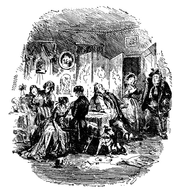 Затем в тихой комнате появилась Сьюзен Нипер вместе со свечами, а вслед за нею чай, капитан и непоседливый мистер Тутс, который, как упомянуто выше, частенько отлучался и провел довольно беспокойный вечер. Впрочем, это отнюдь не соответствовало его привычкам: обычно он чувствовал себя прекрасно, играя с капитаном в криббедж под руководством мисс Нипер и занимаясь вычислениями, связанными с игрой, которая оказалась превосходным средством для того, чтобы довести его до полного отупения.