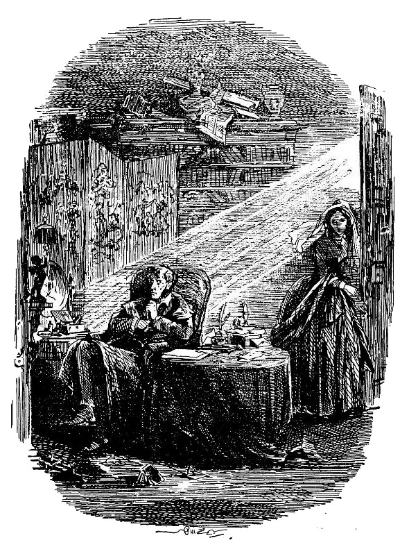 Двойник сел, устремив взгляд на холодный камин, а когда он погрузился в размышления, в комнату проник луч света, солнечный луч. Он ничего не замечал и сидел в раздумье. Внезапно он вскочил, с искаженным лицом, и та преступная рука сжала что-то, спрятанное за пазухой. И тут его остановил крик безумный, пронзительный, громкий, страстный, восторженный крик, – и мистер Домби увидел только собственное отражение в зеркале, а у своих ног – дочь.