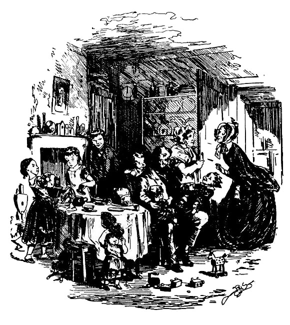 Мистер Тудль, находясь в центре семейной группы и – что касается аппетита – подавая своим детям устрашающий пример, держал на коленях двух юных Тудлей, вез их экстренным поездом в Бирмингем и подумывал об остановке у шлагбаума из хлеба с маслом, когда явился Роб Точильщик в своей зюйдвестке и траурных штанах и был атакован братьями и сестрами.