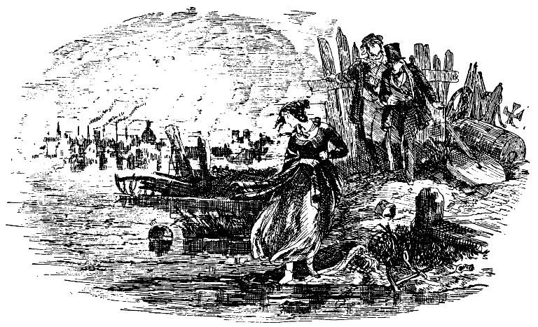 Неподалеку от нее завязли в грязи несколько лодок и баржей, и они-то помогли нам незаметно подойти к ней на расстояние в несколько ярдов. Сделав знак мистеру Пегготи не двигаться, я вышел из нашего прикрытия, чтобы заговорить с ней. Не без страха я приближался к этой одинокой фигуре. Она стояла у конечной цели своего путешествия в кромешной тьме, в тени, отбрасываемой железным мостом, стояла и, не отрываясь, смотрела на отблески огней, игравшие на поверхности быстро текущей воды: и меня охватил ужас.