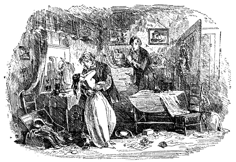 Едва я успел ответить моей спутнице, что видел эту леди раньше, как из комнаты послышался ее голос, хотя слов нельзя было разобрать. Марта, бросив удивленный взгляд, сделала знакомый мне жест, потянула меня за собой вверх по лестнице до какой-то боковой дверцы, которая, по-видимому, не была заперта, и толкнула ее; дверь открылась, и мы очутились в крохотной – чуть побольше шкафа – пустой мансарде с низким покатым потолком. Она сообщалась полуоткрытой дверью с комнатой, которую Марта назвала своей. Здесь, запыхавшись от подъема по лестнице, мы остановились, и Марта дала мне знак молчать, слегка прикоснувшись пальцами к моим губам. Отсюда я мог только разглядеть, что комната большая, в ней находится кровать, а на стенах висят дешевые литографии с изображением кораблей. Ни мисс Дартл, ни той особы, к которой она, как мы услышали, обращалась, я не мог видеть. Тем более не могла их видеть моя спутница, ибо я стоял ближе к двери.