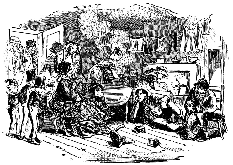 Миссис Пардигл, шествуя впереди с чрезвычайно решительным видом и без умолку разглагольствуя о неряшливости простонародья (хотя даже самые чистоплотные из нас вряд ли могли бы соблюдать чистоту в подобной трущобе), провела нас в стоявший на краю поселка домишко, и мы, войдя в каморку, единственную на первом этаже, – чуть не заполнили в ней все свободное пространство. Кроме нас, в этой сырой отвратительной конуре было несколько человек: женщина с синяком под глазом нянчила у камина тяжело дышавшего грудного ребенка; изможденный мужчина, весь измазанный глиной и грязью, курил трубку, растянувшись на земляном полу; крепкий парень надевал ошейник на собаку; бойкая девушка стирала что-то в очень грязной воде. Когда мы вошли, все они подняли на нас глаза, а женщина повернулась лицом к огню, вероятно стыдясь своего синяка и стараясь, чтобы мы его не заметили; никто с нами не поздоровался.