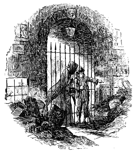 До этого места довольно далеко, но Джо, теперь уже доверяя своей спутнице, выполняет все ее требования и не оглядывается. Они долго идут по кривым проулкам, омерзительным во многих отношениях, и, наконец, подходят к сводчатому проходу, ведущему в какой-то двор, к газовому фонарю (уже зажженному) и к железным решетчатым воротам.