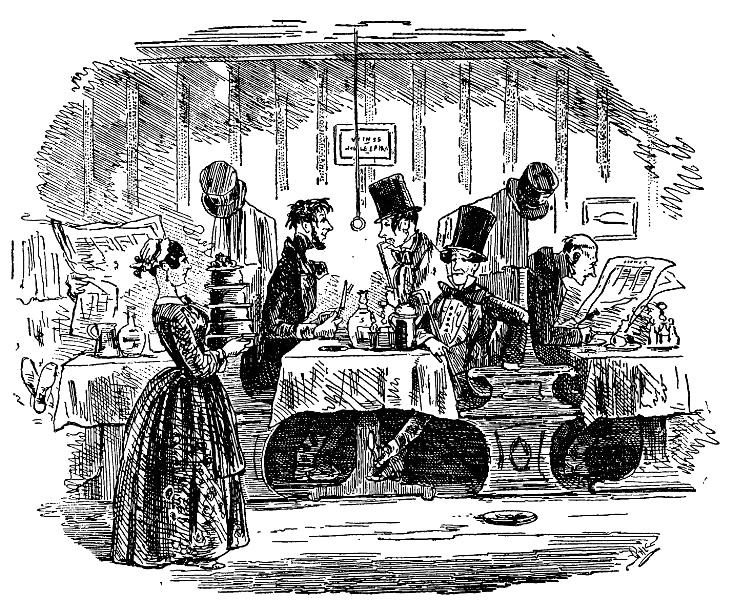 Приносят три пудинга, и мистер Джоблинг шутя отмечает, что быстро близится к совершеннолетию. Затем, по приказанию мистера Смоллуида, подают "три сыра-честера", а потом "три рома с водой". Счастливо добравшись до этой вершины пиршества, мистер Джоблинг кладет ноги на покрытую ковром скамью (он один занимает целую сторону отделения) и, прислонившись к стене, говорит: