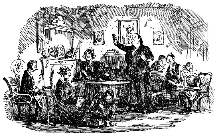 Мистер Снегсби, который уже не на шутку озадачен таинственным взглядом своей «крошечки», брошенным ею на супруга примерно в тот момент, когда мистер Чедбенд произнес слово «родители», поддается искушению и скромно отвечает: «Право, не знаю, сэр». Но этими словами он прервал проповедь, и в наказание миссис Чедбенд бросает на него свирепый взгляд, а миссис Снегсби восклицает: «Постыдись!»
