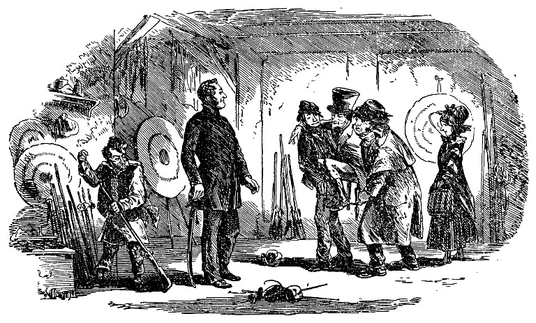 – Любезный друг! До чего я счастлив вас видеть! Значит, это и есть ваше заведение? Восхитительный уголок! Прямо картинка! А не случается у вас, чтобы какая-нибудь из этих штук сама собой выстрелила, а, любезный друг? вопрошает дедушка Смоллуид, очень обеспокоенный.