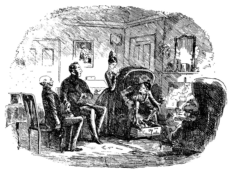 В заключение мистер Джордж встает с кресла, сажает в него мальчика рядом с матерью и говорит с некоторой поспешностью, что пойдет курить трубку на улицу.