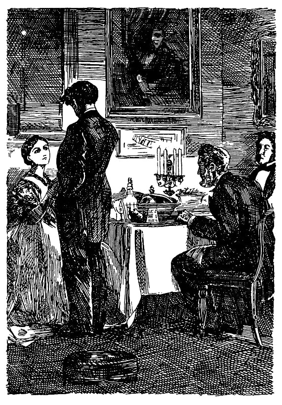 Вечером он обнаружил, что стол накрыт на четверых, однако обедать сели втроем. Мистер Баундерби не преминул воспользоваться столь удобным случаем и обстоятельно рассказал, как вкусно пахли тушеные угри, которые он в восьмилетнем возрасте покупал на полпенни у уличных торговцев; а также о свойствах воды, предназначенной главным образом для борьбы с пылью, которой он запивал сие лакомство. Кроме того, за супом и рыбой он занимал гостя подсчетами, уверяя его, что он (Баундерби) в отроческие годы съел по меньшей мере трех лошадей в виде колбас и сосисок. Все эти рассказы Джим выслушивал, время от времени бросая томное «прелестно!»; и, вероятно, они сильно способствовали бы его решению завтра же опять отправиться в Иерусалим, если бы не острое любопытство, которое возбуждала в нем Луиза.