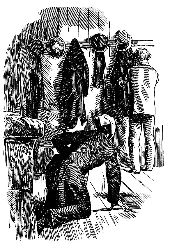 Когда все ушли наверх, пришел мой джентльмен с шинелью. Я указал, куда ее повесить, чтобы мне хорошо было видно; и он ушел; а я пролежал ничком под диваном еще часа два – лежу и жду.