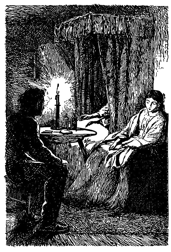 Она поворотилась к нему, и сияние ее глаз озарило кромешный мрак его души. Она сидела подле кровати и ухаживала за его женой. Вернее – он угадывал, что кто-то лежит там, и слишком хорошо знал, что это она; но Рейчел занавесила кровать, и он не видел жену. Ее грязные лохмотья исчезли, и в комнате появилось кое-что из одежды Рейчел. Каждая вещь, как всегда у него, лежала на своем месте, повсюду было прибрано, неяркий огонь подправлен, очаг чисто выметен. Ему казалось, что все это он прочел на лице Рейчел и что он смотрел только на нее. Глаза его наполнились слезами, мешая ему видеть ее, но он успел заметить устремленный на него внимательный взгляд и слезы, выступившие и на ее глазах.