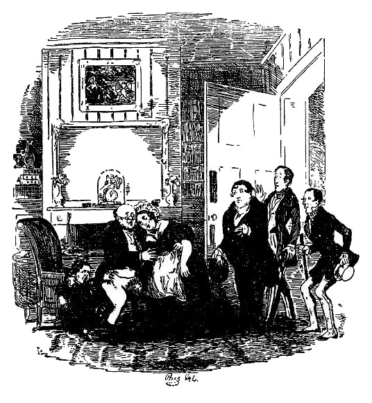 Но как мольбы, так и протесты не достигли цели, ибо миссис Бардл потеряла сознание в объятиях мистера Пиквика, и не успел он усадить ее в кресло, как в комнату вошел юный Бардл, а вслед за ним мистер Тапмен, мистер Уинкль и мистер Снодграсс.