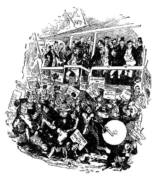 После некоторых настояний со стороны мистера Потта и повторных отказов со стороны мистера Пиквика, не считавшего возможным причинять неудобства или хлопоты любезной супруге мистера Потта, было решено, что это единственно осуществимый план, на каком можно остановиться. На нем и остановились, а засим, пообедав вместе в «Городском Гербе», друзья расстались: мистер Тапмен и мистер Снодграсс пошли к «Павлину», а мистер Пиквик и мистер Уинкль направили свои стопы к дому мистера Потта, условившись заранее, что утром они все соберутся в «Городском Гербе» и будут сопровождать процессию почтенного Сэмюела Сламки до того места, где будут провозглашаться кандидаты.